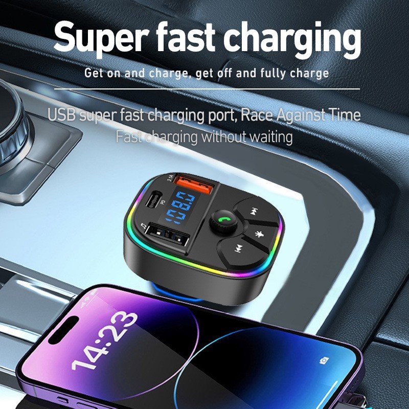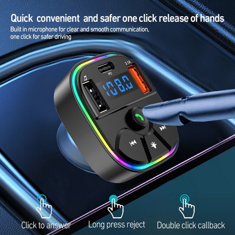 Portable car Bluetooth hands-free FM transmitter MP3 music player with USB connection PD charger and color ambient light