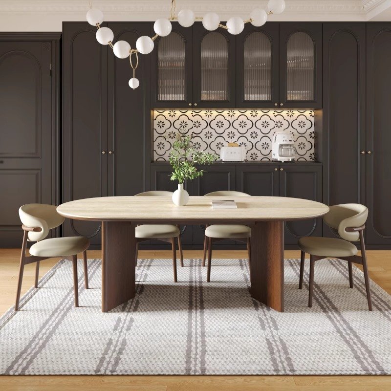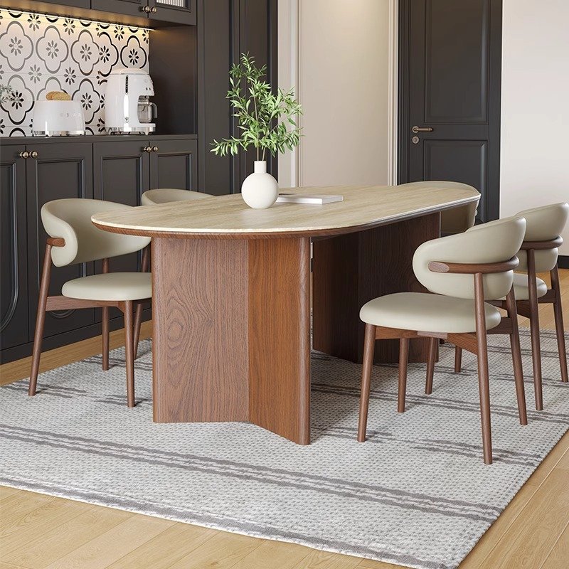 Mid century luxury modern oval marble solid wood dining table and chair set with 4 to 6 seats, fully furnished with limestone design in the kitchen