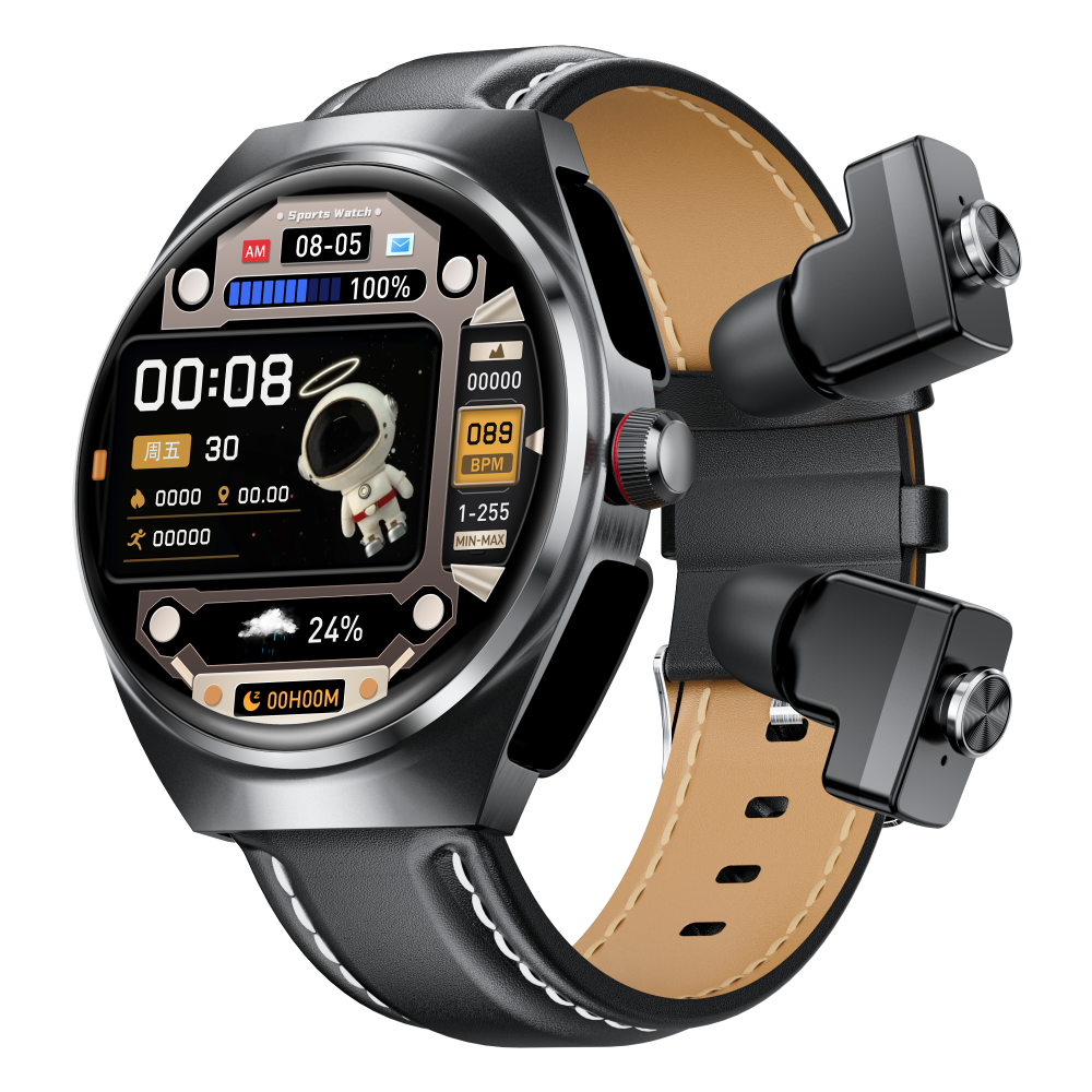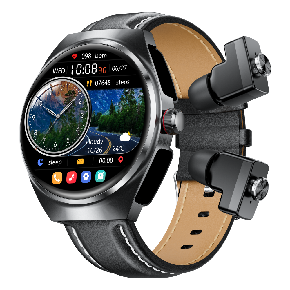 2025 Best New Smart Watch Leather Strap, 2-in-1 Earbuds and Fitness Tracker with Heart Rate Monitor