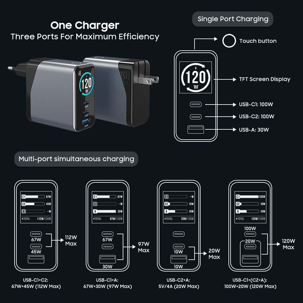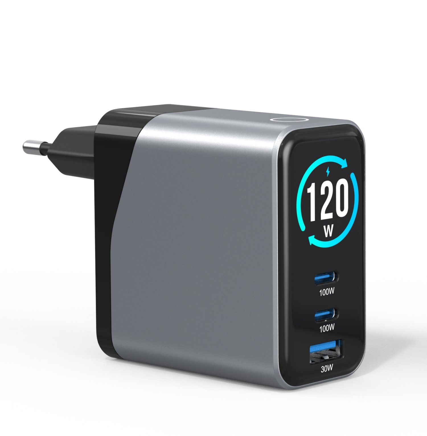 Laptop Charger 120W Max USB Charger 3-port Multi Device Fast Charging with TFT Display for iphone samsung 120W Charger