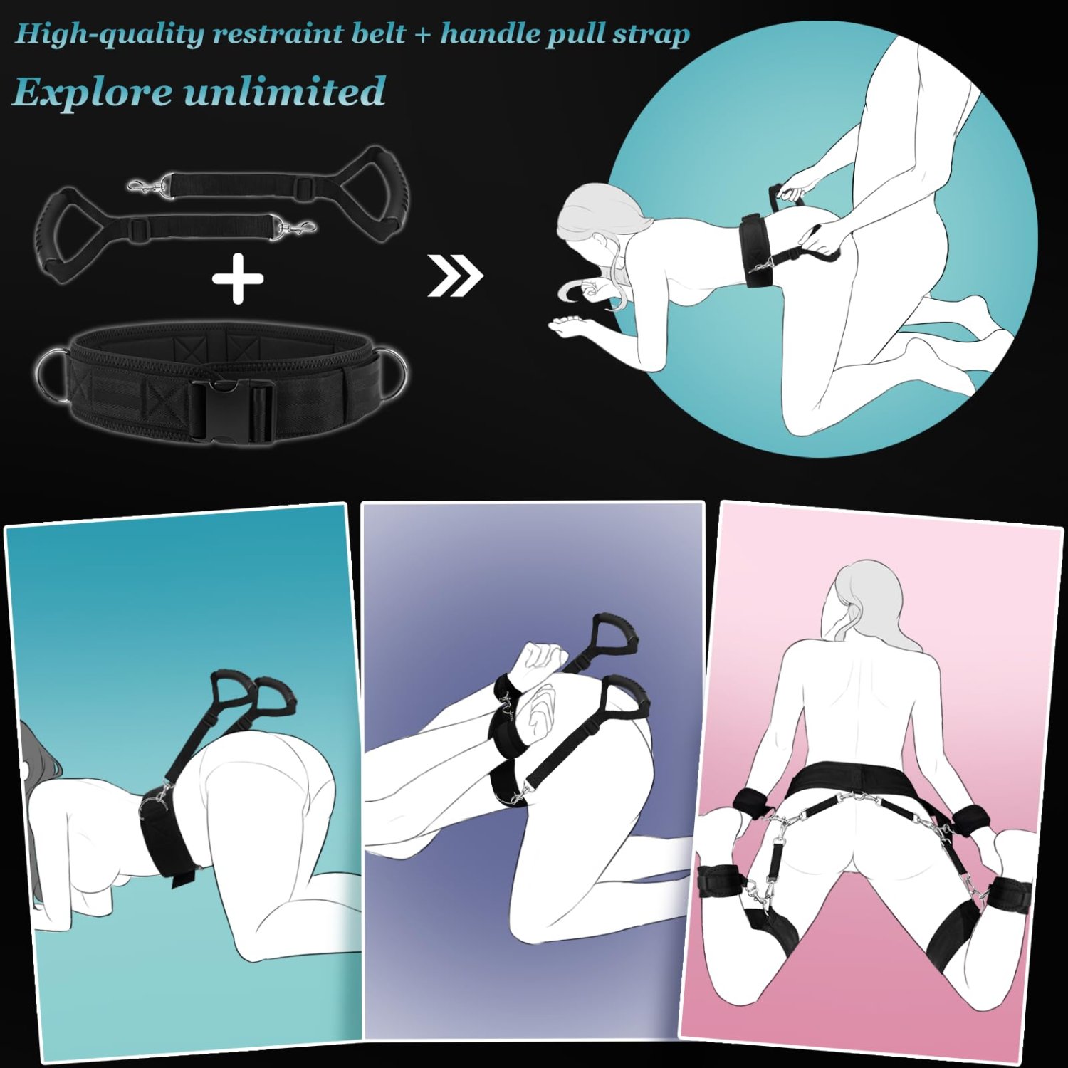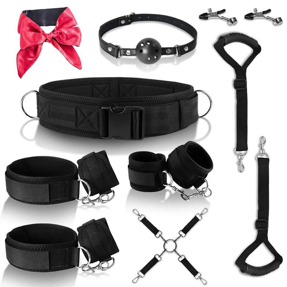 Adjustable handcuffs, leg cuffs, thigh cuffs, mouth cuffs, eye mask clips, 9-piece restraint kit, sexual restraint BDSM, female adult couple toy